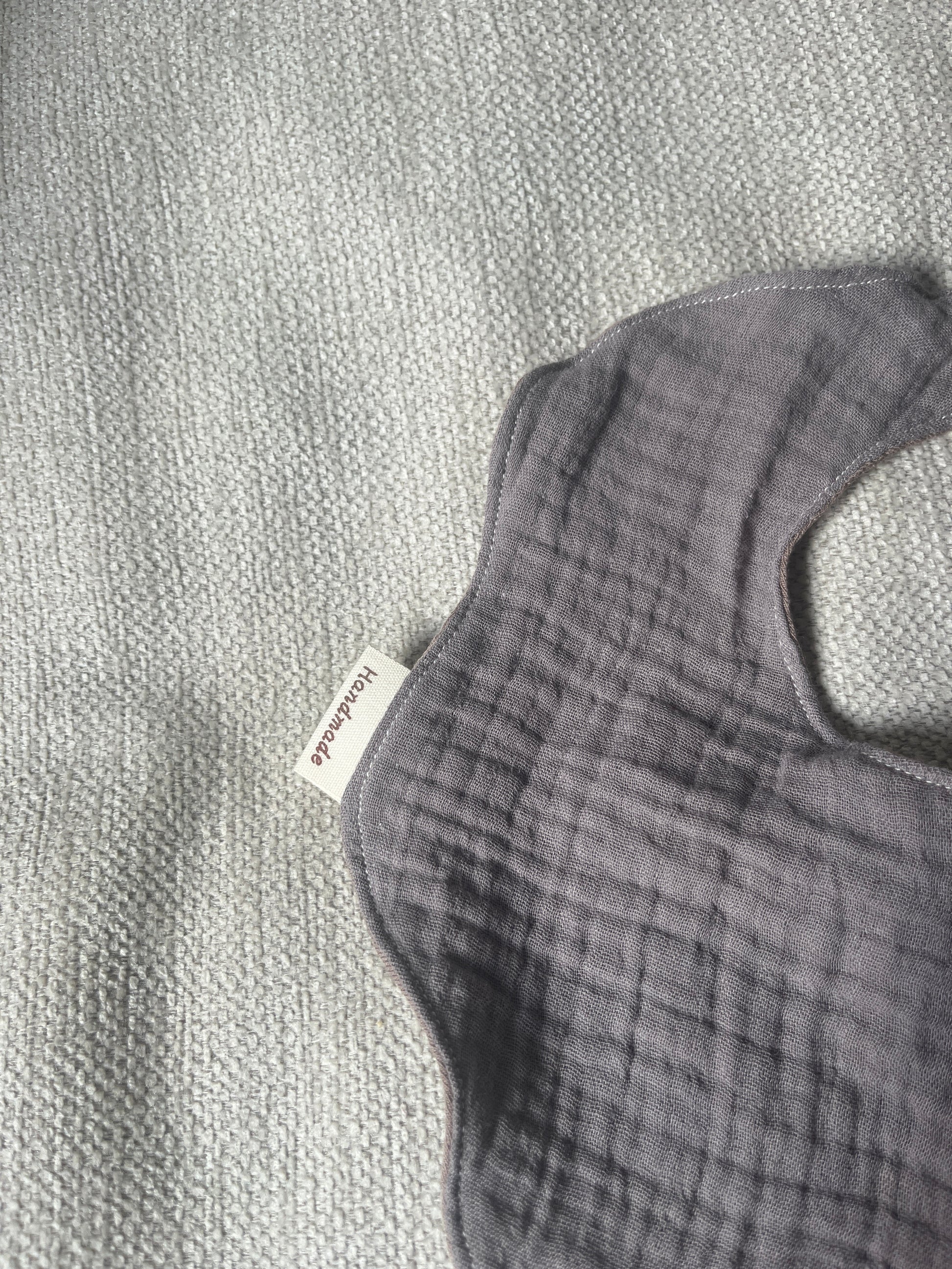 Grey soft drool bib in muslin and cotton fabric, soaks up drool easily. Handmade by Emanuel’s mama, Frida!🩶